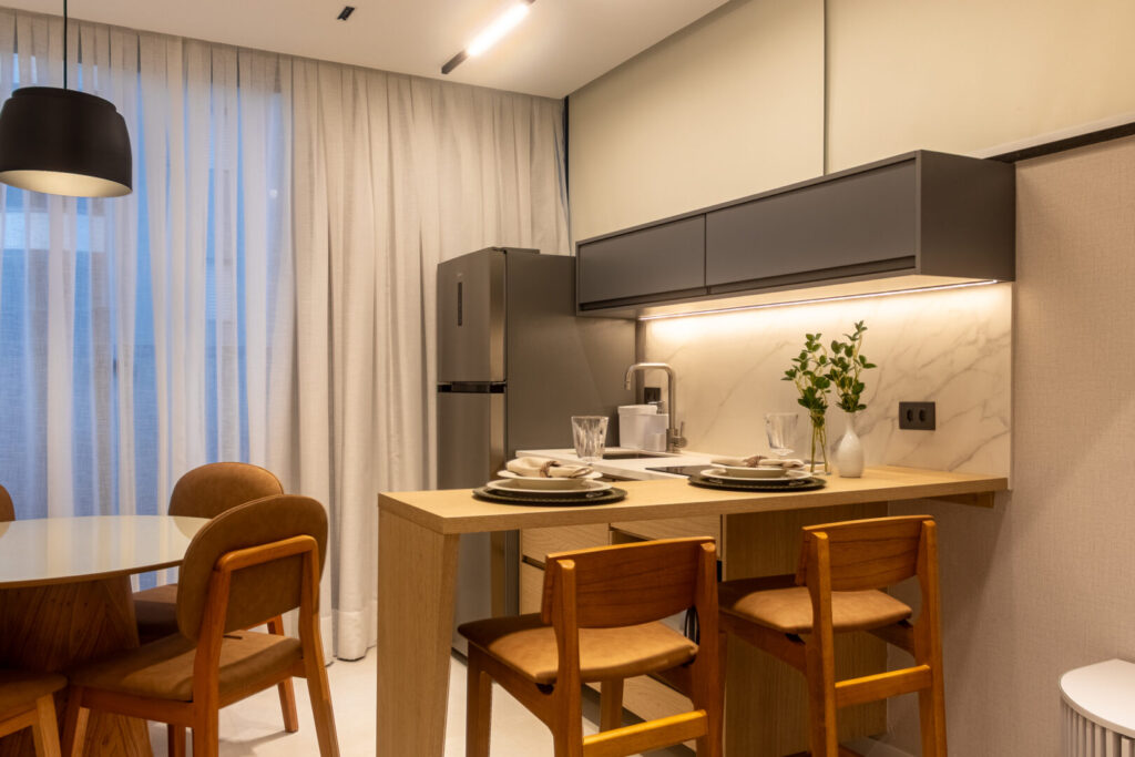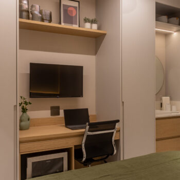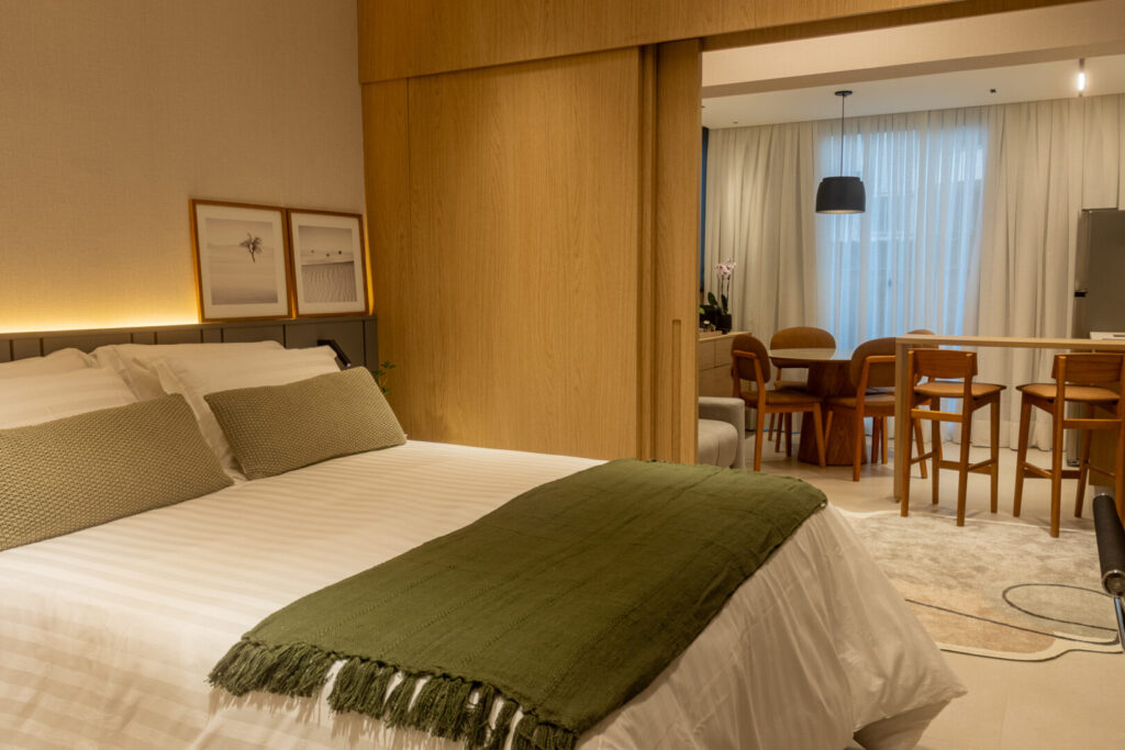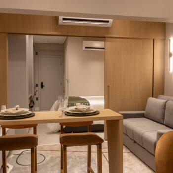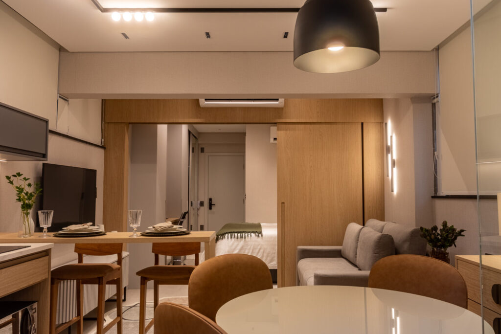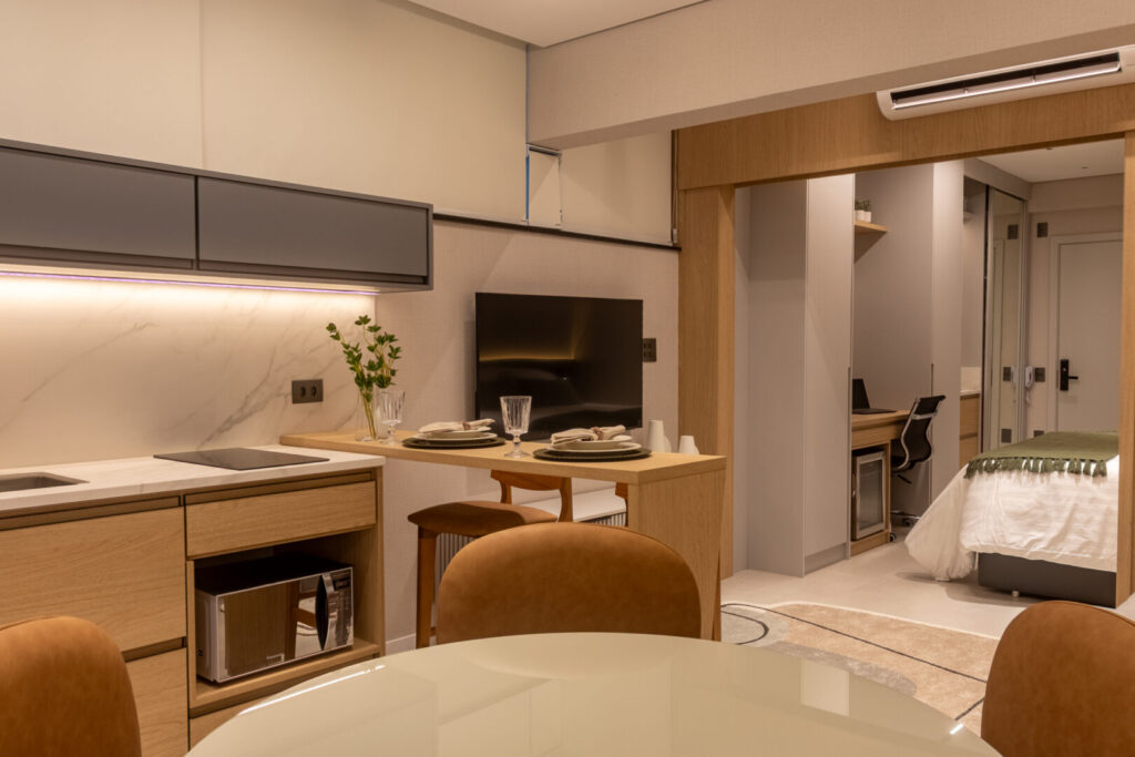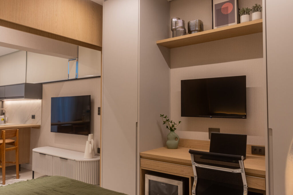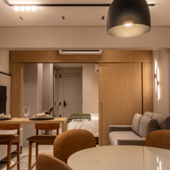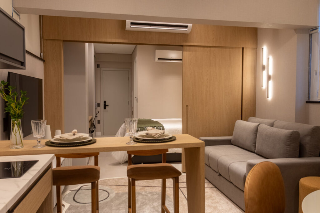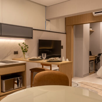 Um apartamento Studio, no coração do bairro do Jardins em SP. Seus 20m² contam com espaço para banheiro, dormitório e área de office e cozinha integrados. Detalhe, este apartamento é um Garden, ou seja, tem uma área externa a ser contemplada. Acrescenta 20m² neste espaço e o resultado é o que você pode conferir nas imagens abaixo. 40m² integrados que passam a ter disponível sala de TV com cozinha integrada e junto, uma varanda ao final do apartamento para contemplar a luz do sol poente próximo a avenida Paulista.